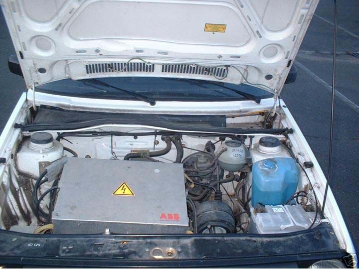 Como podemos ver, varía respecto a un Volswagen Golf Mk2 normal, en su trasera. Destaca un gran cajón, donde debería ir la rueda de repuesto, para poder así albergar las baterías. A continuación, vemos dos imágenes de dicho cajón y lo que nos encontramos si abrimos el capot:
