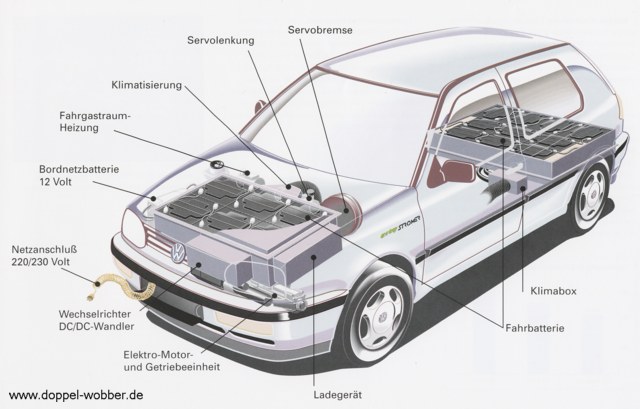 ma de recuperación de energía al frenar y 16 baterías de plomo-ácido que hacían 180 Ah y 96 voltios. Era 480 kg más pesado que un Golf normal debido a las baterías de plomo-ácido. El motor desarrollaba 17,5 kW de potencia y las baterías se podían recargar en una hora y media. Esto hacía que el tiempo para acelerar de 0 a 100 km/h se incrementara a 27 segundos. Tenía una velocidad máxima de 97 km/h y una autonomía de aproximadamente 80 km. Aunque la autonomía real era de 70 km en verano y 40 km en invierno.