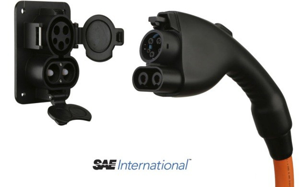 Conector SAE J1772, a veces conocido también como Yazaki. Es un estándar norteamericano, y es específico para vehículos eléctricos. Mide 43 mm de diámetro. Tiene cinco bornes, los dos de corriente, el de tierra, y dos complementarios, de detección de proximidad (el coche no se puede mover mientras esté enchufado) y de control (comunicación con la red).
